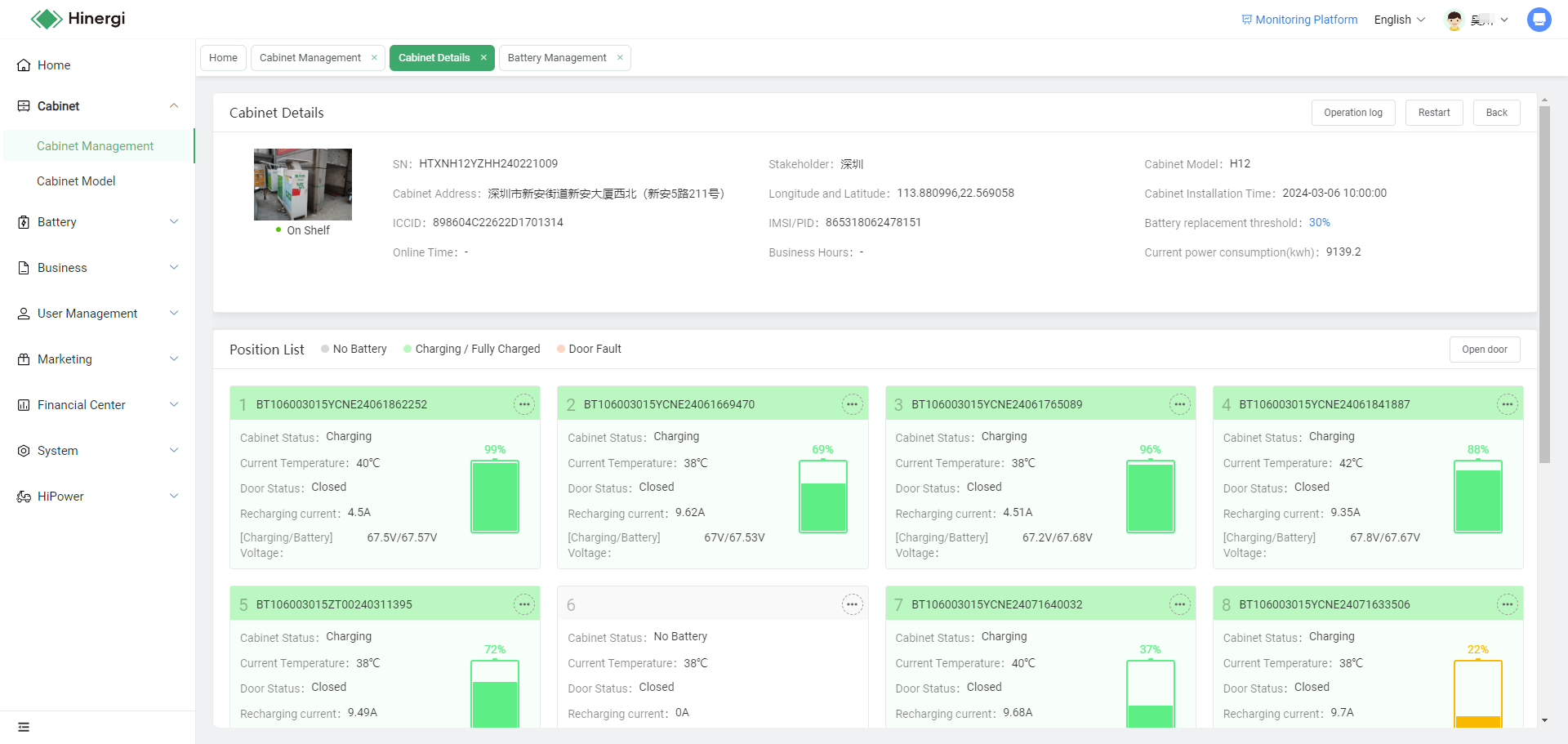 Cabinet management includes cabinet asset management, cabinet efficiency statistics, and cabinet control such as shelving and de-shelving. You can view the information of each compartment and each battery in the cabinet, and remotely open, close or disable compartments. Restart cabinets, etc. Battery management includes battery asset management, battery hardware monitoring and control, and battery inventory management.